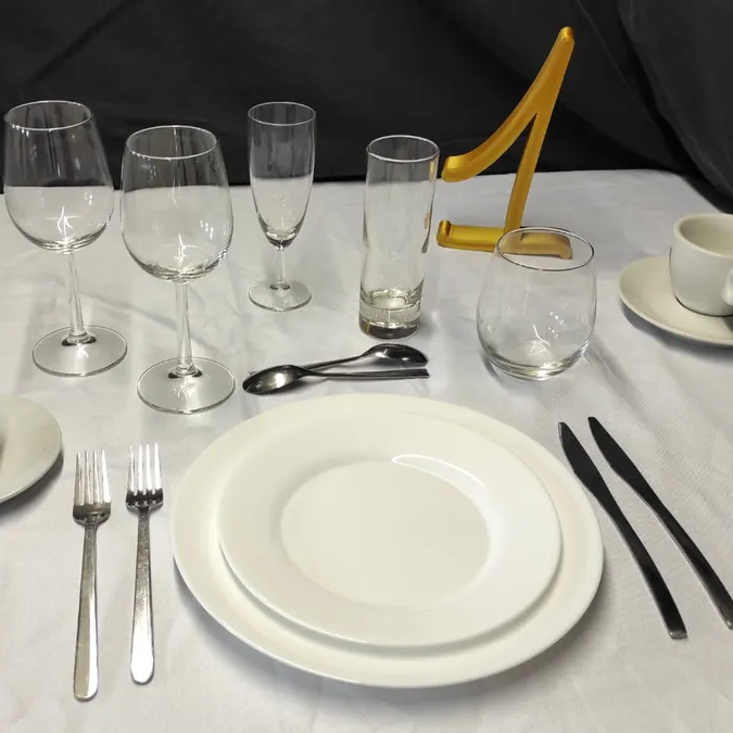 -1 Verre a vin -1 Verre a eau -1 Flûte a champagne -1 Grande assiette blanche -1 Petite assiette blanche -1 Jeu de couverts
