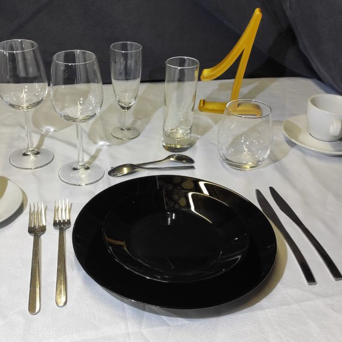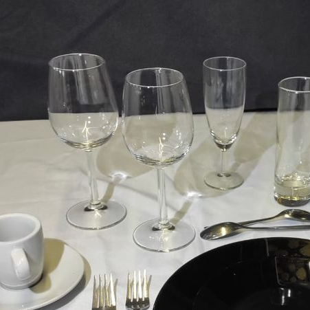 -1 verre a eau -1 verre a vin -1 Flute a champagne -1 Grande assiette -1 Petite assiette -1 jeu de 3 couverts